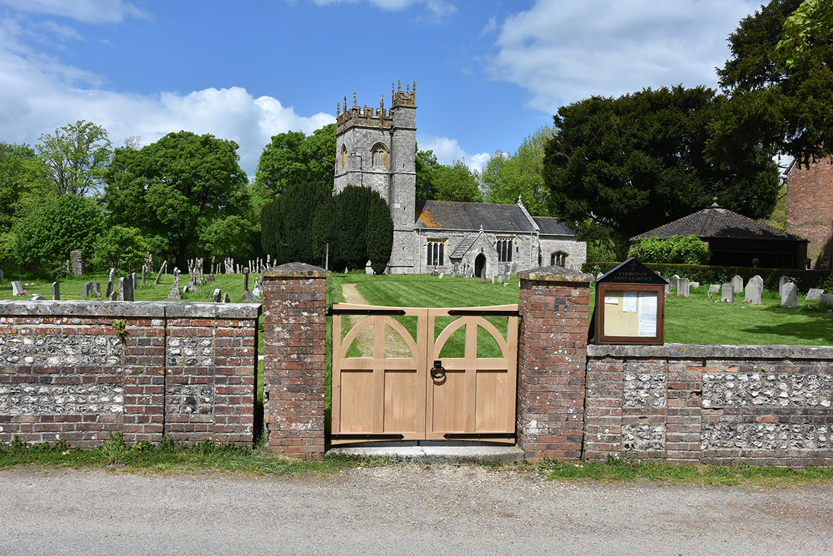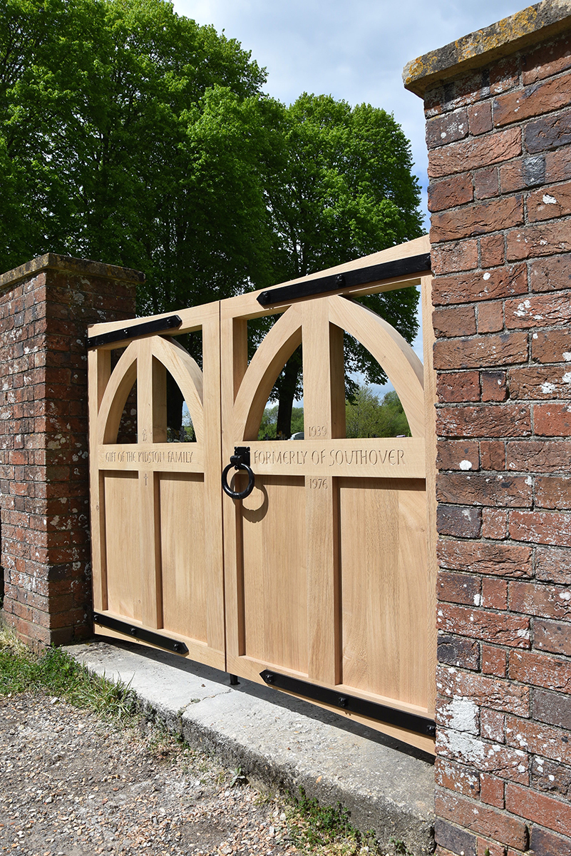 Finally, a commission from a church we already know well: St Laruence’s at Affpuddle is the closest church to our workshops, several years ago we also made a striking sycamore & oak memorial table for the side aisle. This time we were asked to make new gates into the churchyard. Although we were initially approached by the PCC they did have a benefactor who lived overseas but had grown-up in the parish and wanted to commission the gates as a gift to the church and as a family memorial. The new gates are a refined version of the existing gates which had been hanging for around 50 years but had become tired and started to rot. We added some subtle curved top and bottom rails and simplified the centre cross to be able to take some script for the family memorial text. We commissioned Zoe Cull of Stoneform to come up with some beautiful curved bespoke script work on the centre cruciform rails. The client asked for some locally sourced Dorset oak. We found a very nice, air-dried log through Will Miller who often sources and saws rare, local logs for us.