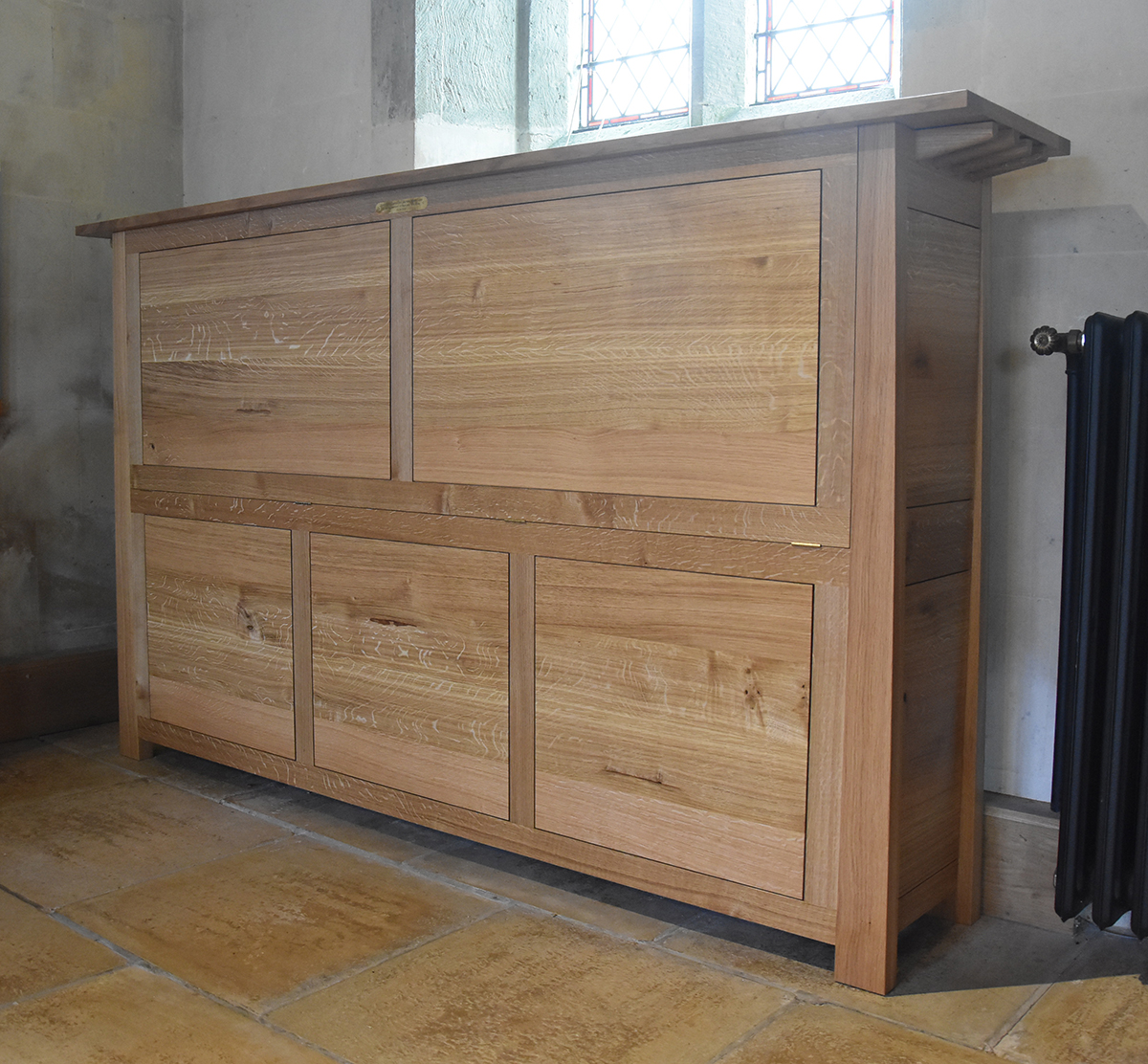The next piece is a frontal chest, used for the storing the altar cloths in St Andrew’s Church in Fontmell Magna. It was commissioned by a couple for whom this church is very important; the piece is both a gift to the church and a lasting memorial to a grown-up son who sadly passed away recently. Again made entirely out of solid oak this large cabinet is solely for hanging and airing altar cloths that only get used at very specific times of the religious calendar.