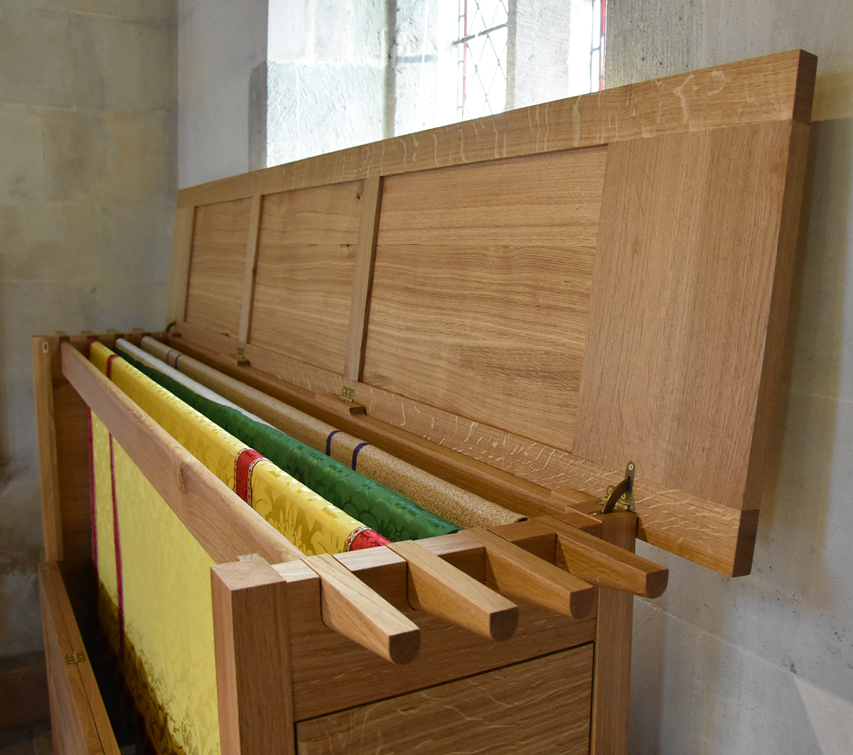 While being a simple piece to look at, ensuring airflow through the textiles and that they can be easily lifted out made this a challenging piece to design. It’s sheer size, governed by the cloths it has to store, also made getting the correct proportions challenging. The end result is a classic piece of English ecclesiastical furniture with a subtle hint of the contemporary with those crisp, shadow-line detailed, oak panels. The other feature that stands out are the 4 the hanging rails that break out from the frame to form the sloped lifting handles under the overhanging top. With half of the front panel and top hinging open this makes changeovers simple.