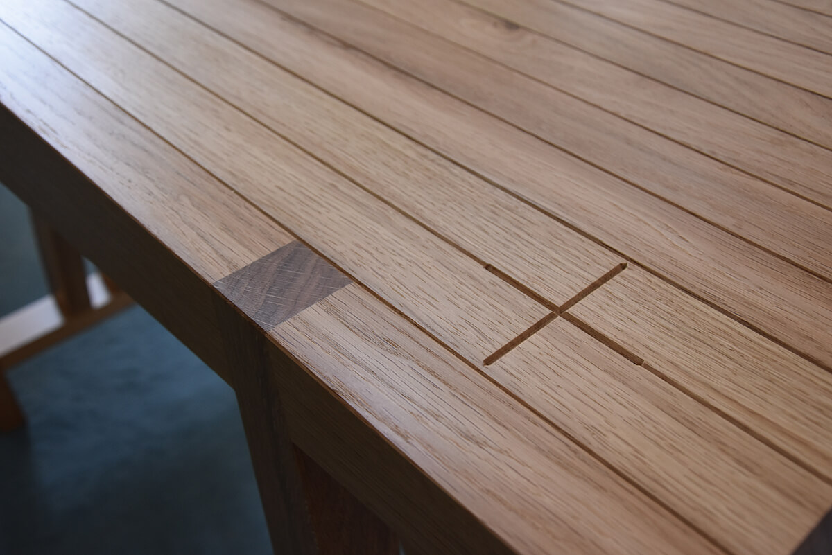 The first of these projects, a new nave altar, was for St Mary’s Church in Morden. On visiting this unusually light and airy Parish church, Simon was immediately struck by the beautiful way in which the nave arch and the West window followed the exact same curve and so it made perfect sense to replicate this feature in the under-frame of the altar table. The whole thing is made from solid oak with the top constructed from 11 separate shaped pieces, this is emphasised by a small v-groove running along the length of the top creating a visibly grooved surface. 5 simple crosses are inscribed slightly deeper into the top of the altar joining the v-grooves. It’s a simple but striking detail. Now taking its place under the nave arch, the altar complements the simple beauty of the church interior.