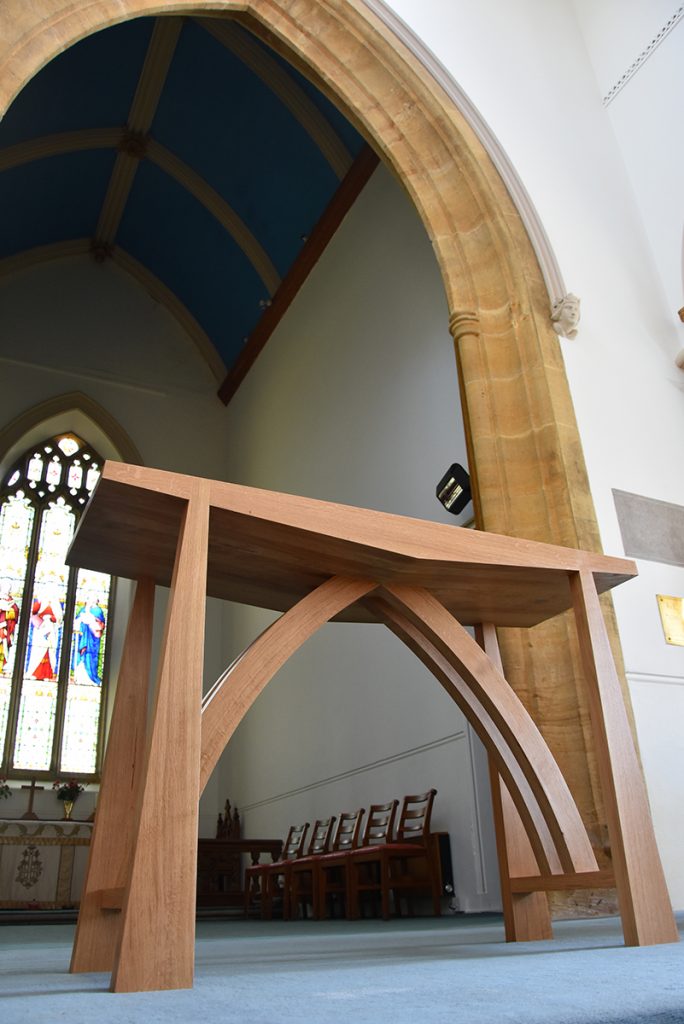 At Simon Thomas Pirie Ltd we pride ourselves in being able to turn our hand to any furniture-related job be it big or small. This year we have been fortunate to have been approached by three separate local churches to help them with very different projects. Working within the architecture of these beautiful sacred spaces always gives us lots of scope for dramatic designs that domestic furniture rarely enjoys. There are also millennia of history, faith, tradition and religious practice to draw on and sometimes move away from. Fertile creative ground!