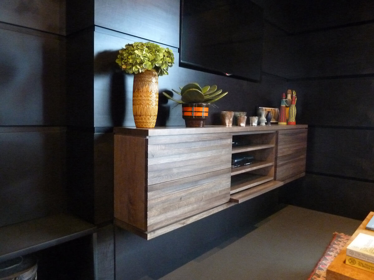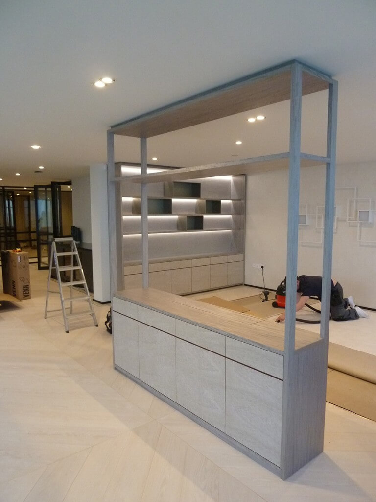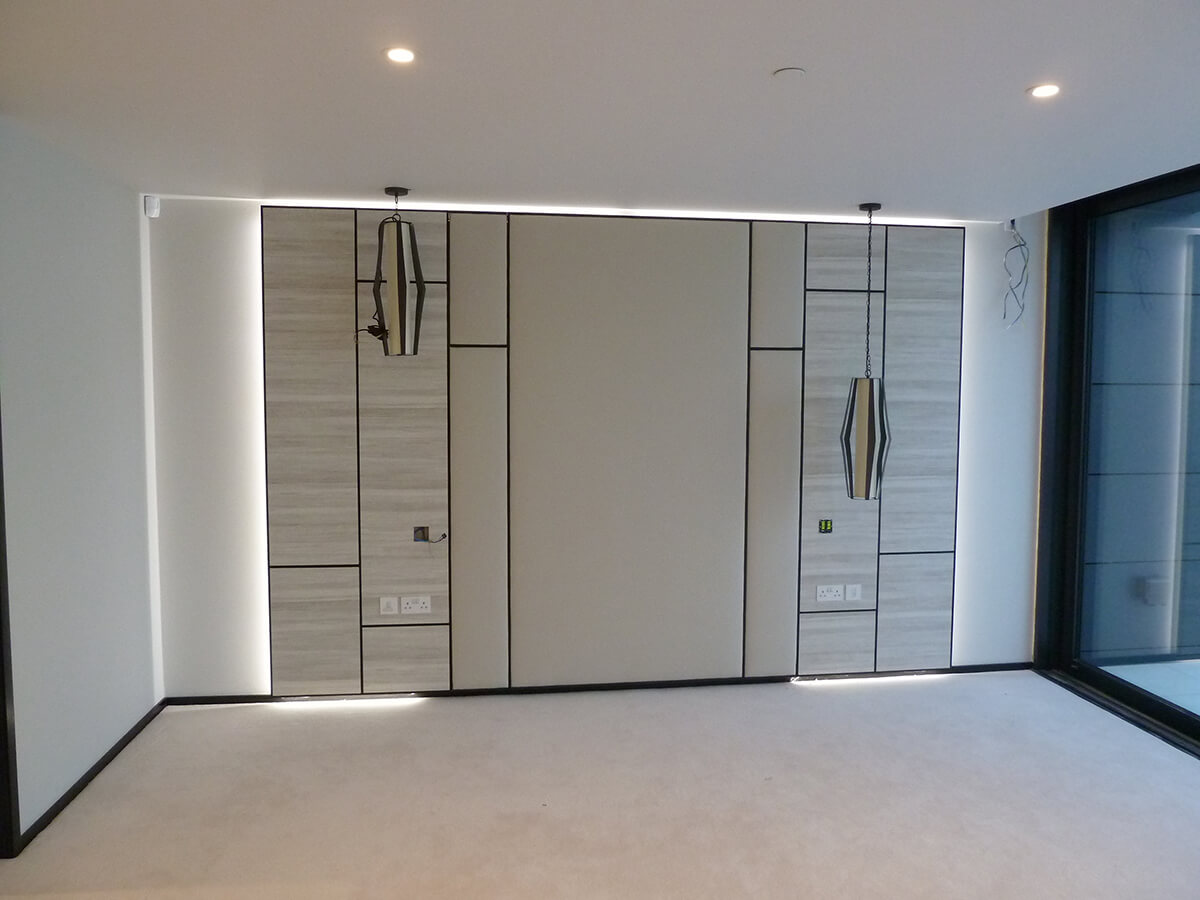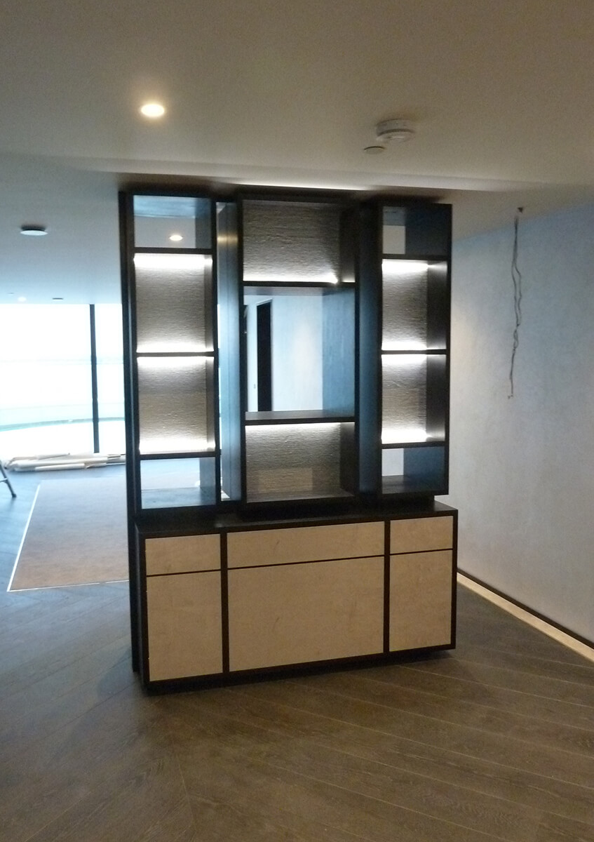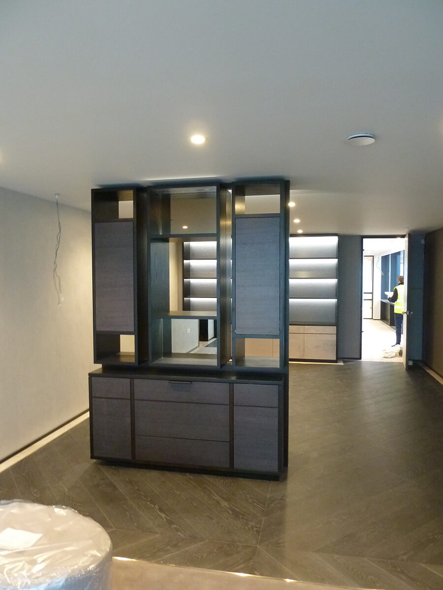 We worked intensively with the Woadden Nash, Westcoast and Colmar team on developing very narrow 35mm skirtings, picture rails and decorative door linings throughout the apartment and these were the first elements to be fitted. The furniture consisted of all the wardrobes and dressing rooms in the 4 bedrooms, dressing tables, master en suite bathroom cabinetry, master bedroom furniture and panelling, shelving and TV cabinet for the living area, as well as the shelving for the night lounge / study. Last but not least is the two sided bar cabinet which stands in the centre of the room – my favourite piece on the project.