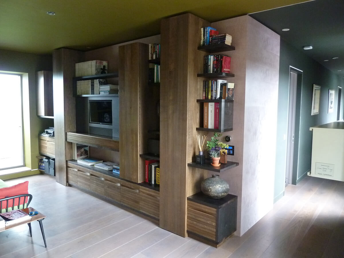 The living and dining space shelving in ply and black tulip wood at Wick Lane – Scheme by Jigsaw Interior Architecture.