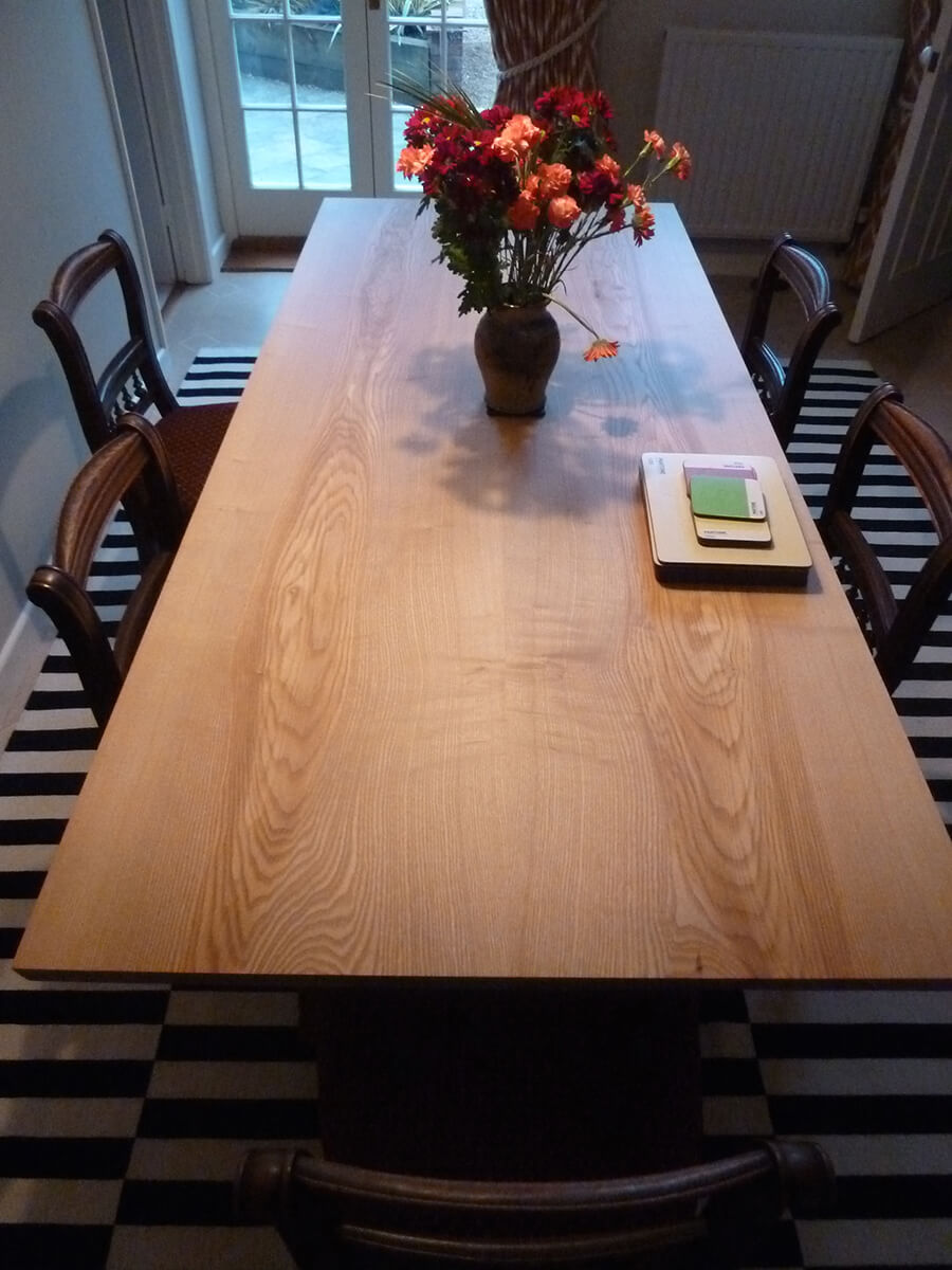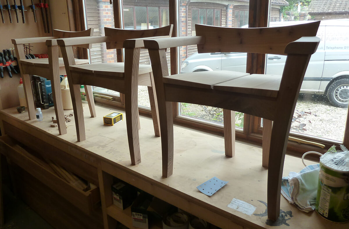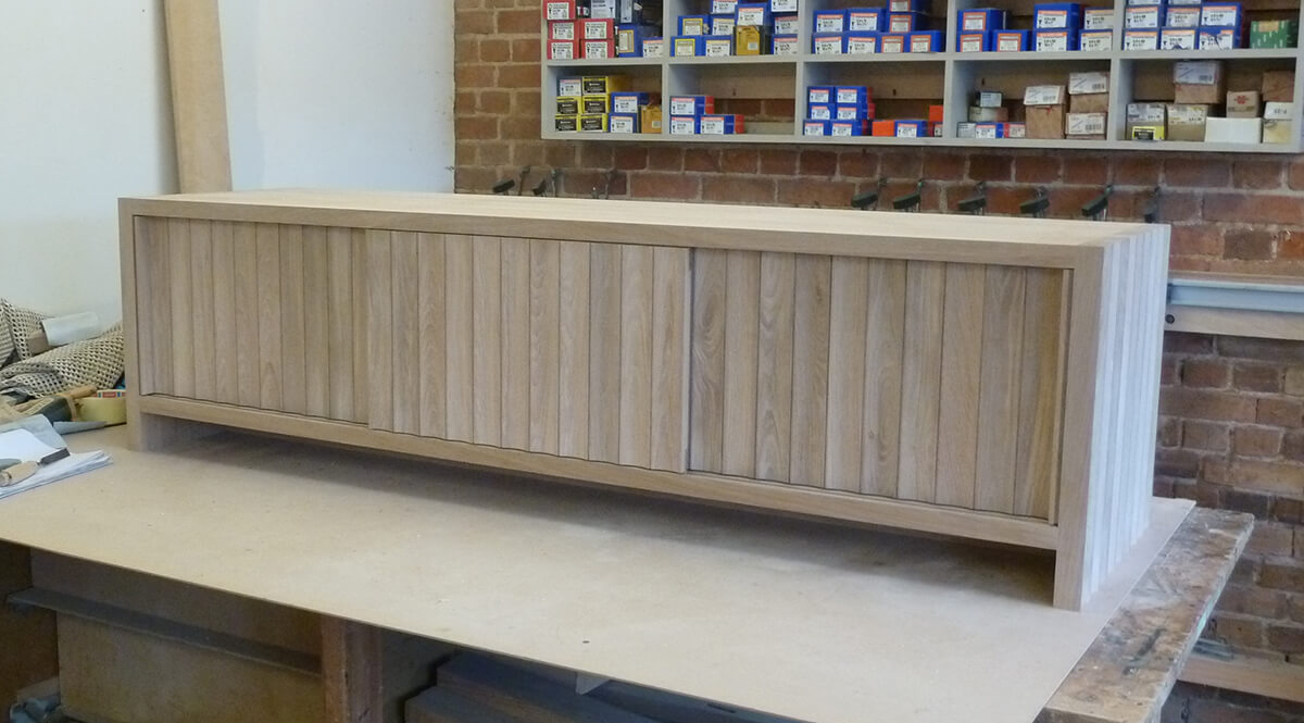 ‘Perch’ chairs in elm as ruby wedding present to match existing STP table and benches. Top right – Stunning olive ash and fumed oak dining table – chairs to come! Bottom – Media sideboard in oak with scollop detail panels.