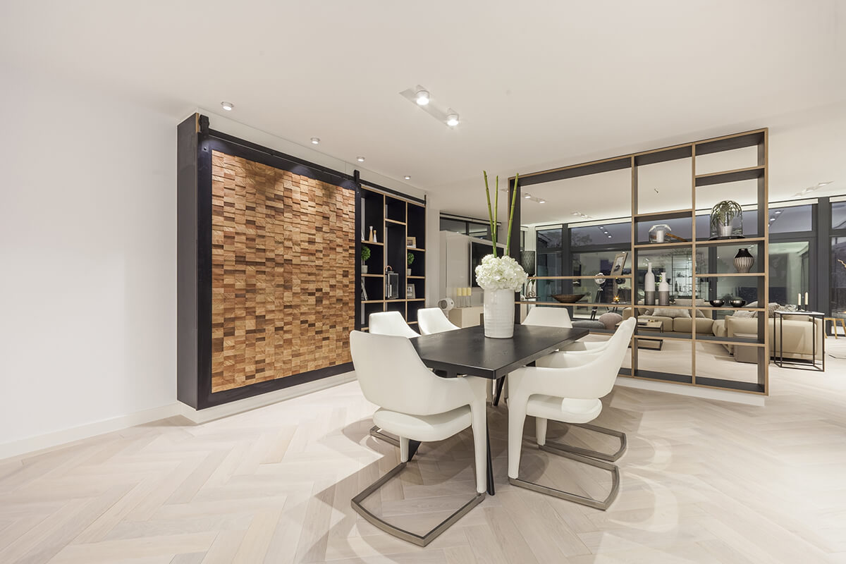 On the collaboration theme we continue to build relationships with interior design practices, high-end developers and architects. They come to us for our very bespoke skill set and the fact we can help them elevate their concepts into something real and exquisite. One such project was with Jigsaw Interior Architecture and AMD Developments in a new property by the river in Christchurch. This stunning contemporary build utilised a very calming neutral interior palette which is both elegant and subtle. We were asked by Jigsaw to work on the staircase liaising with the metal fabricators to produce the timber stair treads and landing elements as well as a couple of large room divide / display storage shelves. These were made in a birch ply and a black face veneer. They look simple but were much more tricky to make then they initially appear. One of these had a large siding end grain panel on industrial castors that covers half of the display space.