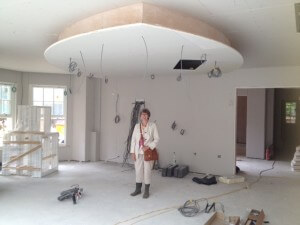 As you can see from the floor plan there is nothing predictable about this layout, the islands run at an angle with a gangway between them. The islands are called ‘Fire’ and ‘Water’- one being for the wet services: sinks, dishwasher, zip tap etc, the other being where the cooking takes place – hence ‘Fire’. There is an huge dropped canopy for lighting and extraction over the islands which looks a little ‘close encounters’ right now!