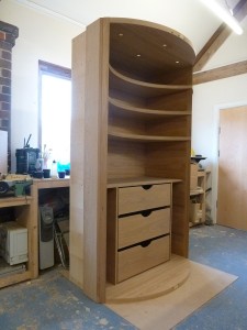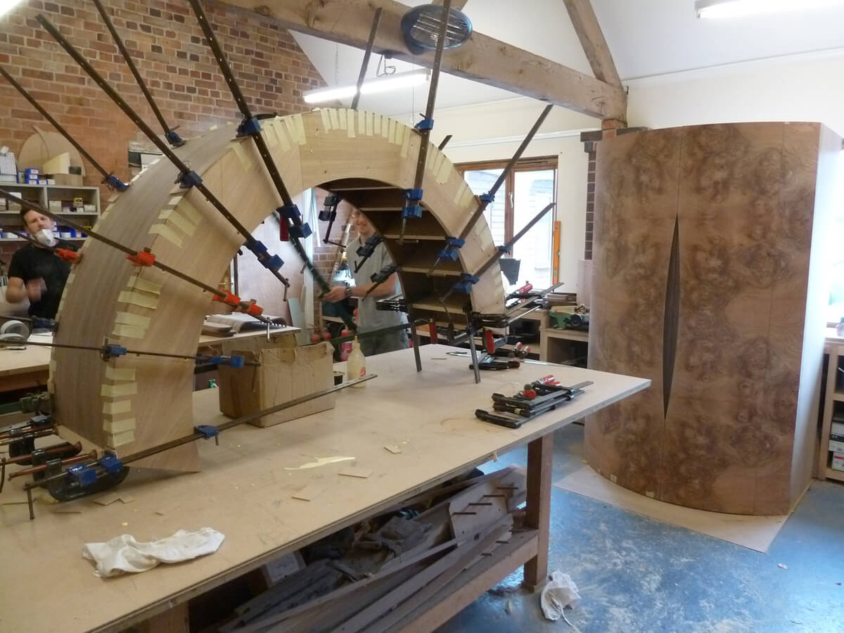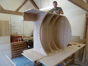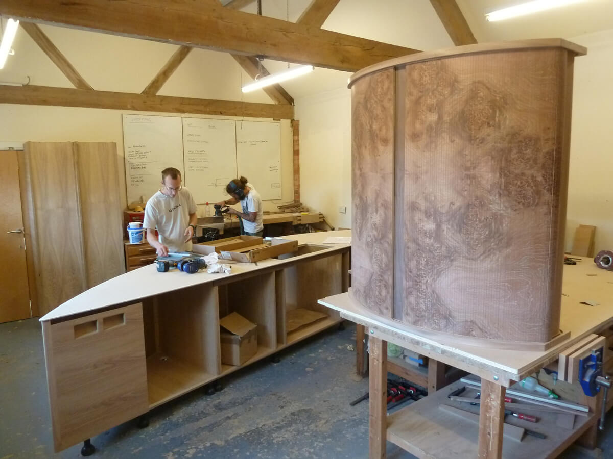 The curved door walk-in larder unit is as big a single piece of cabinetry as we have ever made. To carry on the sci-fi references it looks rather like our very own bespoke workshop tardis, just rather more curvacious! We are using burr elm on the outside of this as well as on the sideboard element of the ‘Water’ island (facing the table) and on the curved centre drinks / display cabinet; these become the ‘feature pieces’. The image at the top of this story shows the burr elm sliding tambour which is the top section of that drinks cabinet, the 4 metre long ‘Water’ island is behind it.