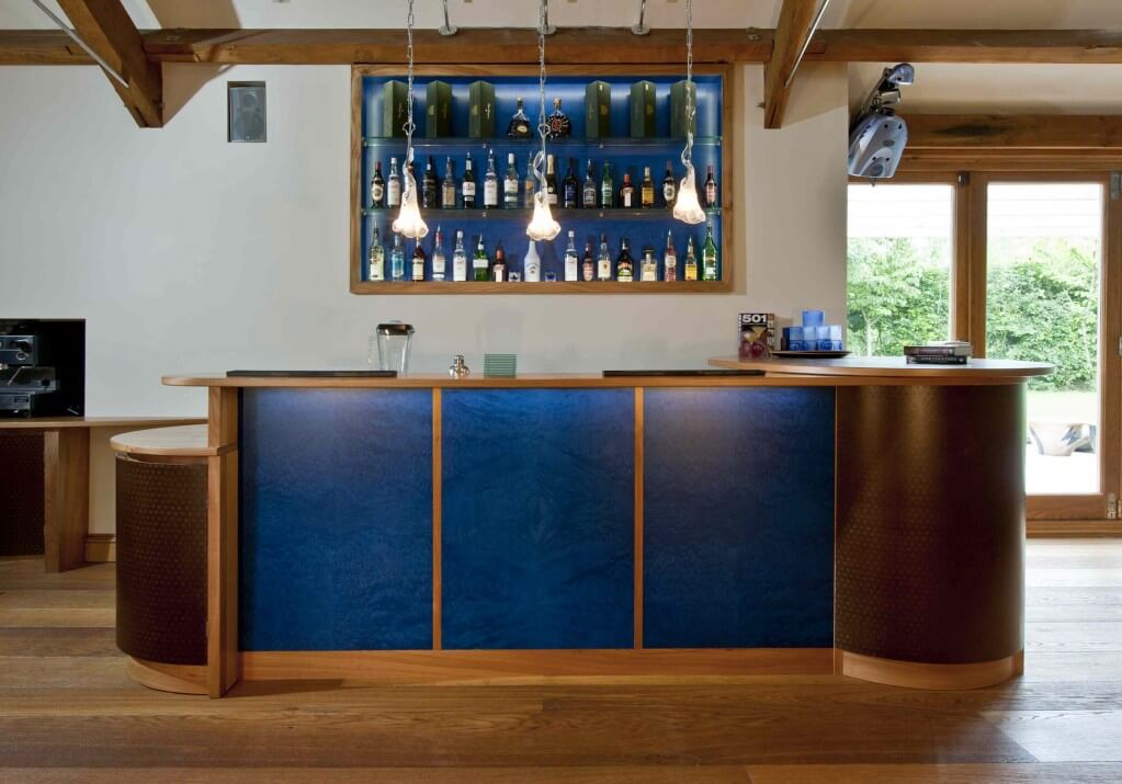There are shared details and design themes that work across the bar, office and kitchen spaces. The obvious one is the D-end curved cupboard unit which is constructed and detailed in the same way the kitchen island ones. The clients loved those soft end curves, they make spaces flow and somehow feel sociable to gather around, important for an entertaining space.We used lots of LED warm white lighting on this area and used this to pick out the blue madrona burr on the front of the bar and the bottle shelving recess behind.