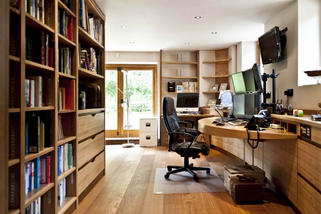 The main desk is a canter-levered curved burr oak surface with a drawer that protrudes from a 6 metre run of concave storage units with doors and drawers in, as well as loads of complex technology behind those 6 trading screens, multiple phone lines and 2 TV’s. There is a more intimate secondary desk area in the corner as well as a set of shelves with built-in sliding bookends.