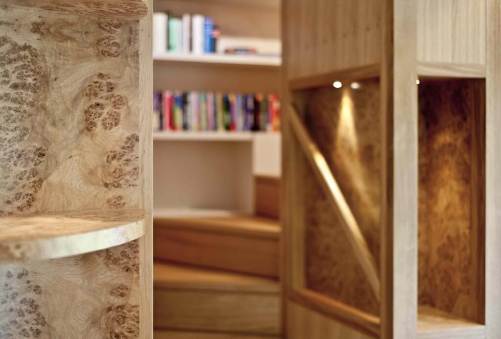 On the other side of the room is a long set of bookshelves and storage which end at a set of curved burr oak display shelves. These give another one of our soft lead-ins to the surprise of the room – a bespoke oak staircase that rise up to a mezzanine snug / reading area. This was the real challenge of the whole project, not just because it was the first staircase we had designed and made, it is also integrated with alcoves and shelves. As is often the case, the simpler something looks the more technically challenging it is to make. That was certainly true in this case.