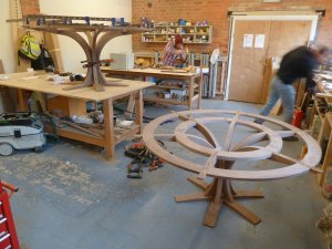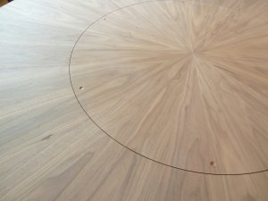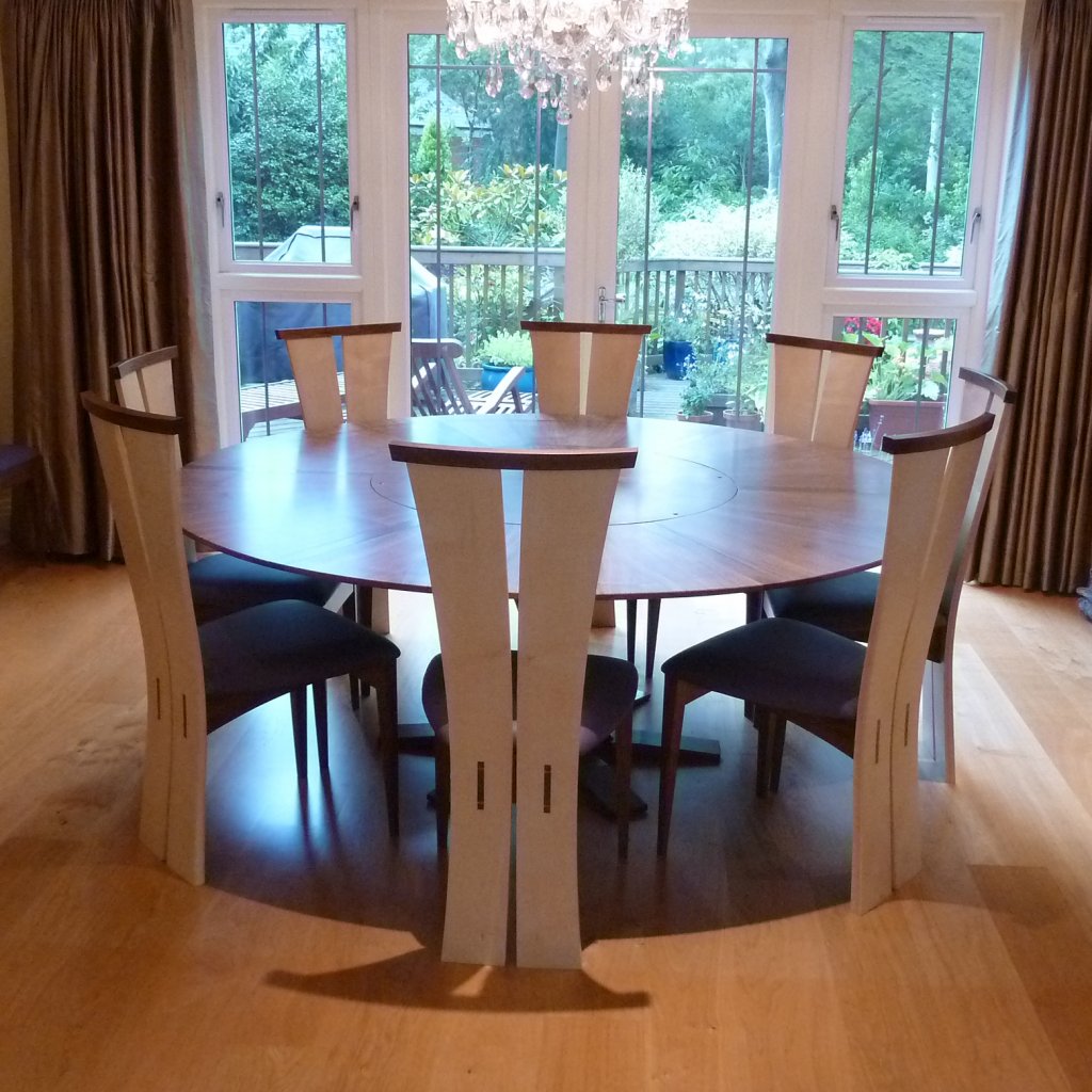 For those clients who are lucky enough to have space for a round table, the challenge of how to reach across the middle was met by Simon designing a table top which incorporates a ‘Lazy Susan’ – a central section which can be released to spin around. Dinner guests can help themselves to the delights served up for them without having to pass or reach hot dishes across the table. The wheel section can be locked in place, perfectly matching up the radial grain with the rest of the table top and preventing it from spinning, particularly useful when there are curious children present at the dinner party!