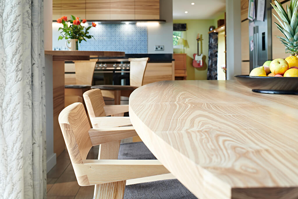 As well as deciding on the size and shape of your dining table, having one designed especially for you means that you get far more choice when it comes to the timber and finish. There is nothing better than a large flat surface to really show off the beauty of one of our native hardwoods: oak is solid and reliable, the workhorse of the farm kitchen, a symbol of longevity and always a favourite for a dining table, but other timbers serve equally as well.