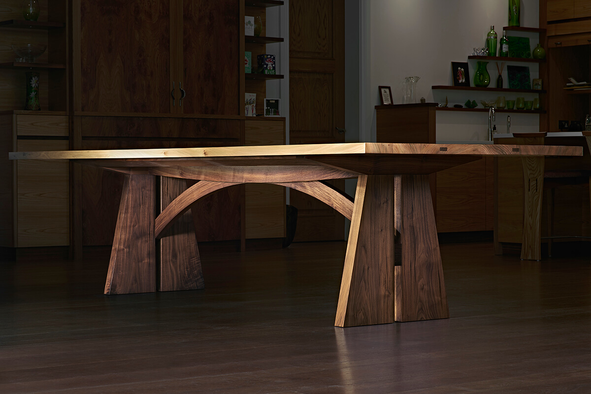 The age old difficulty of additional guests at the dinner table is commonly which unfortunate has to sit astride a table leg. Simon has solved this problem in several different ways over the years and regularly this has been using a variation of an arched beam underframe. On a rectangular, lozenge or oval table this forms an elegant sweeping central arch along its length reaching the ground via pedestals set back from the ends of the table so that no one straddles the legs or bangs their knees. With a round table, several arches create a stunning and sculptural single pedestal underframe which we have dubbed ‘The Tree of Life’.