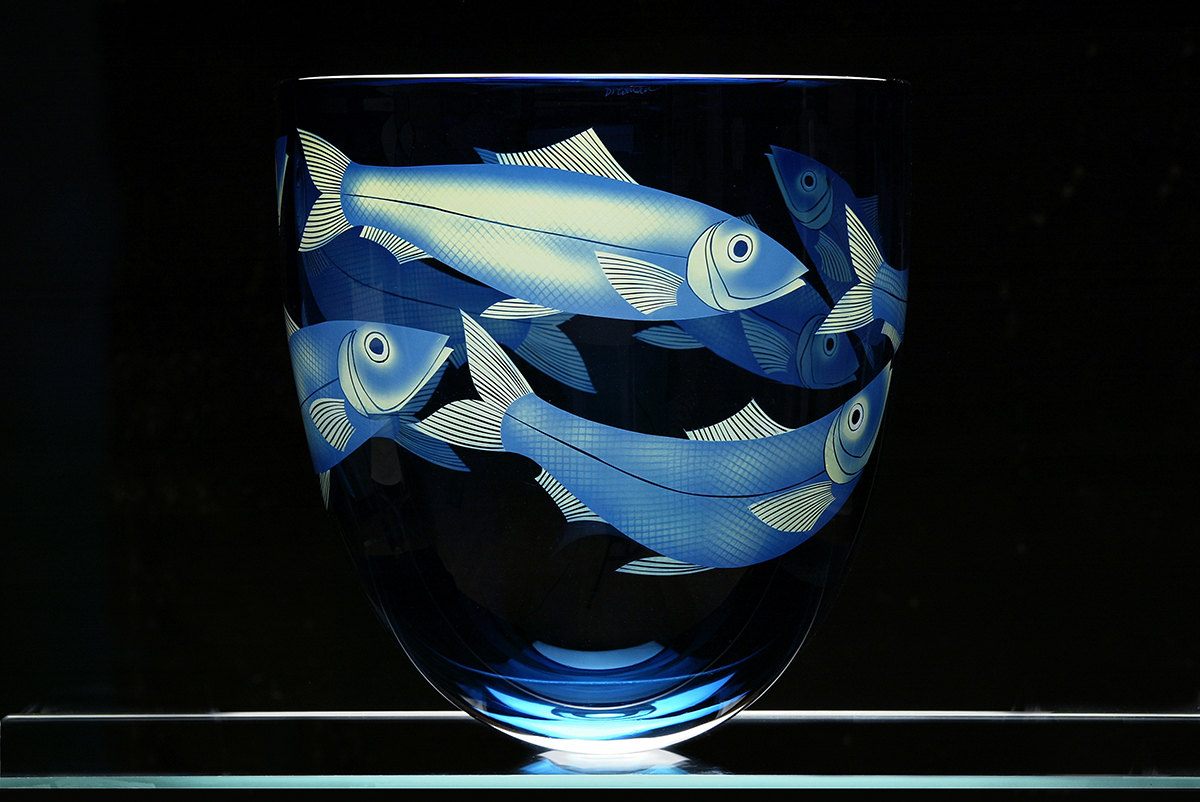 This glass has been both liquid and solid, blown and carved in the process of its creation. Simple forms frame the flowing images brought to life by light and colour.