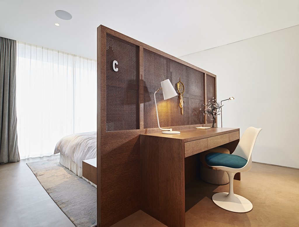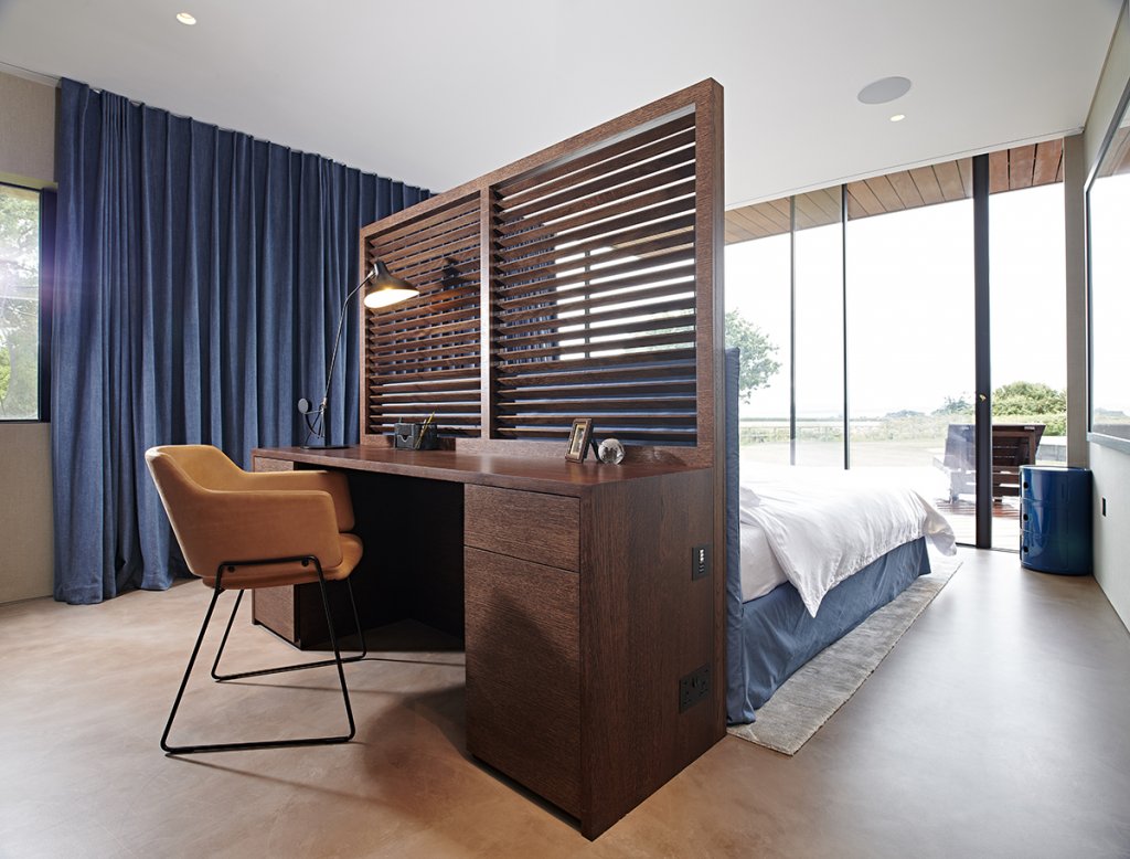 Our next challenge was headboards. In two of the bedrooms we were asked to assist in designing and making freestanding headboards with the bed and built in bedside tables on one side facing the fully glazed wall with big landscape and sea views, and a desk on the reverse. Both were similar but in different stained oak timbers with a different solution to the partially see-through screen – one having a horizontal timber slats, the other with cane wicker panels. These headboard / room divides were really successful at helping define the spaces but not over furnishing them. The bedrooms were only a modest size but retained their spacious feel as a result.