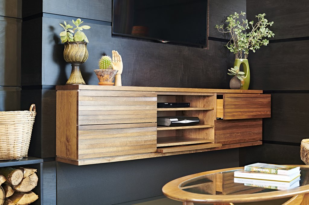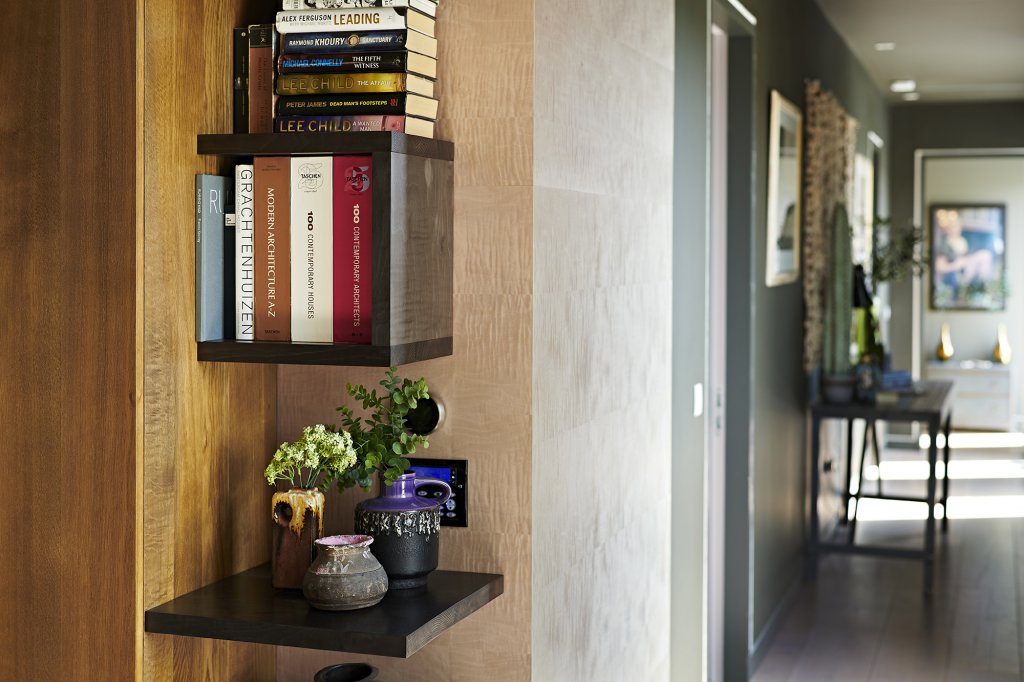 Our work helped to disguise some awkward junctions in the building’s CLT panels and unify them to create a cohesive space. I particularly like the built out area around the large TV and which includes the slotted-in letterbox-shaped fumed oak media cabinet below. We also hid all the speakers at floor level behind a grey/black fabric panel making them all but invisible.