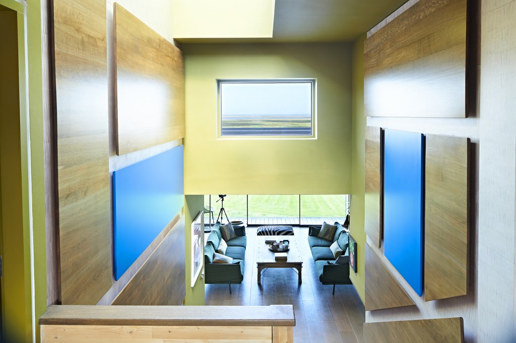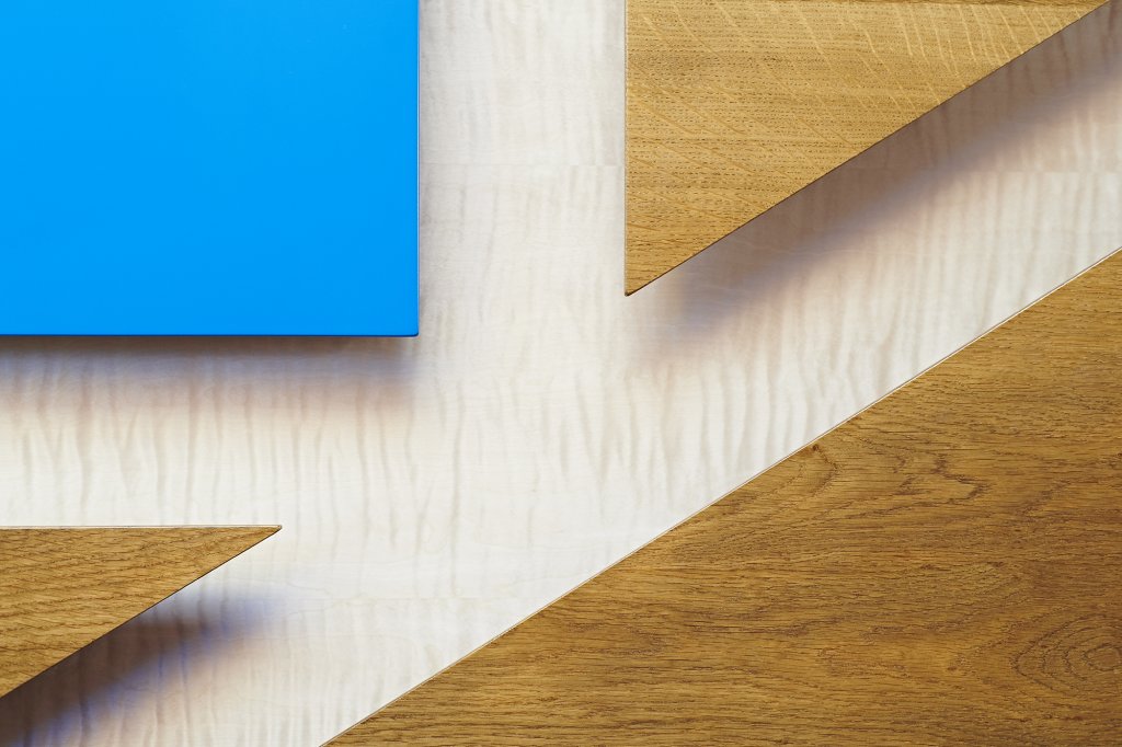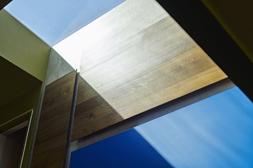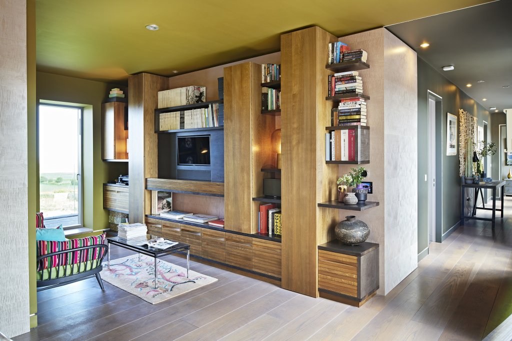 The three-way colour scheme consisted of a wall of pink figured sycamore with cobalt blue and fumed oak panels. It’s like an enormous abstract landscape painting, monumental in size, part of the building itself and connected to the wider land, sky and seascapes through the openings of windows and roof lights.