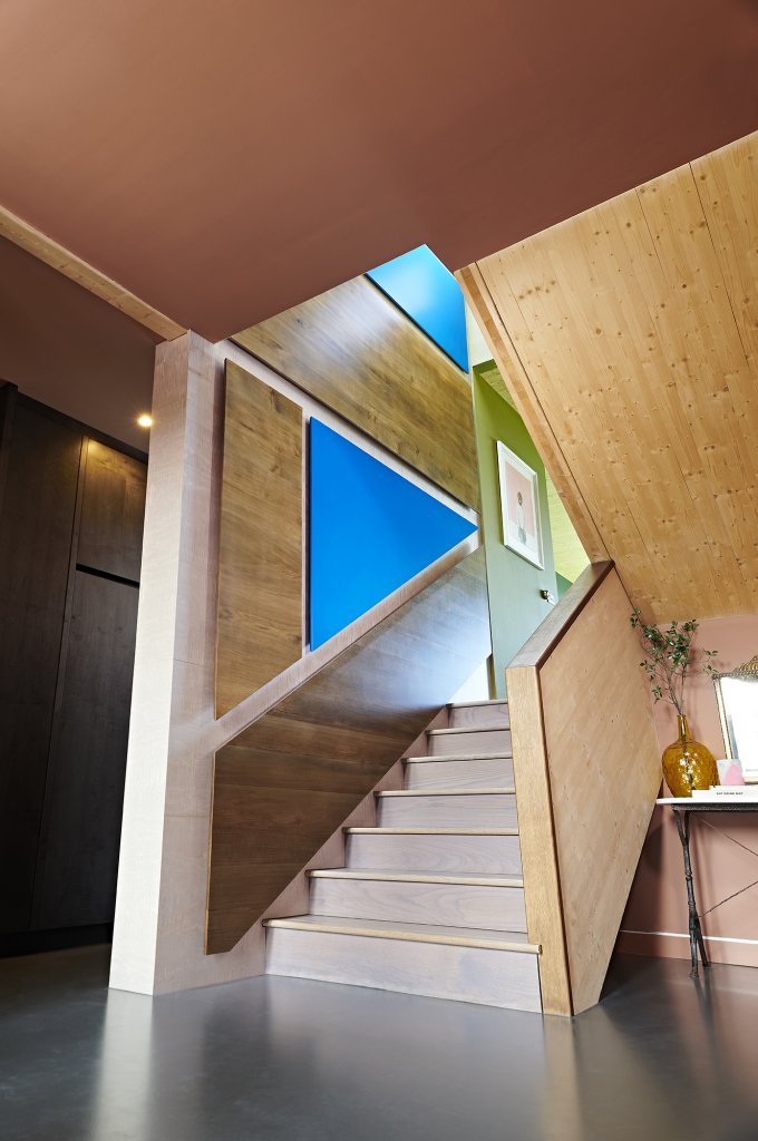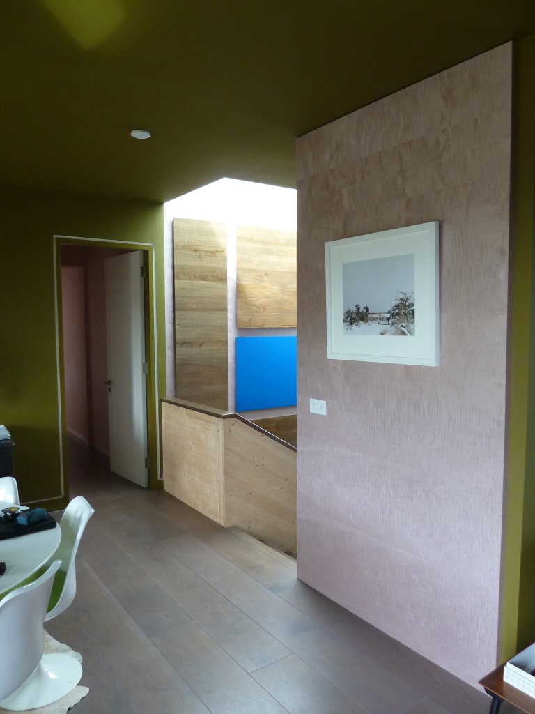 The three-way colour scheme consisted of a wall of pink figured sycamore with cobalt blue and fumed oak panels. It’s like an enormous abstract landscape painting, monumental in size, part of the building itself and connected to the wider land, sky and seascapes through the openings of windows and roof lights.