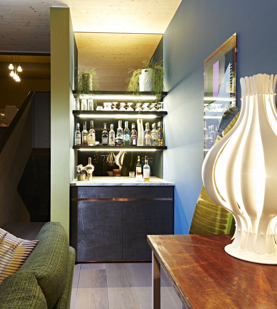 The Sea Room has a completely glazed wall which opens up onto a balcony with staggering views over the salt marches and wildlife reserve. Though our contribution to this room is relatively small; the stair wall panels lead into this space perfectly from both the ground and first floors, we also made the key bar area. Although small, the bar really comes to life at night through the lighting, colour and reflective mirror and glass material palette. It is made in charcoal grey sycamore, copper and fumed oak but here is surrounded by rich blues and greens. This piece starts to pick up on the materials we use downstairs in the living kitchen and snug areas – but more of that in a moment. Like the mezzanine Sea Room itself, the bar acts as a transition piece / space.
