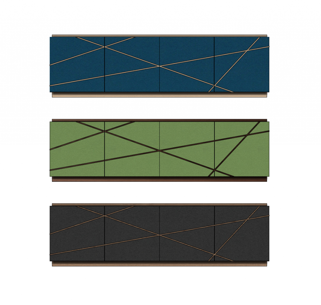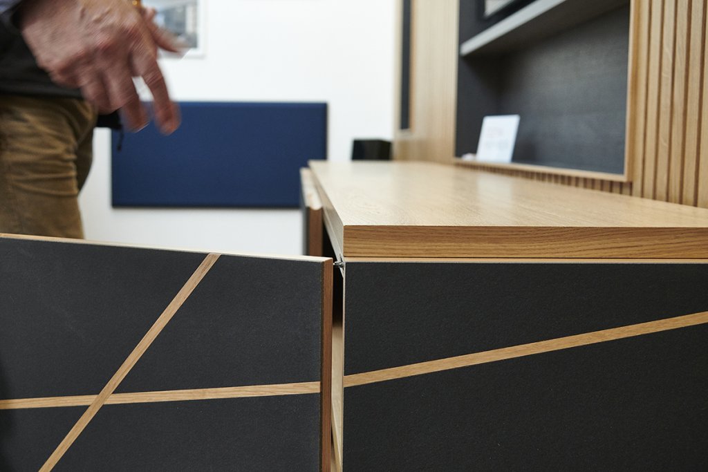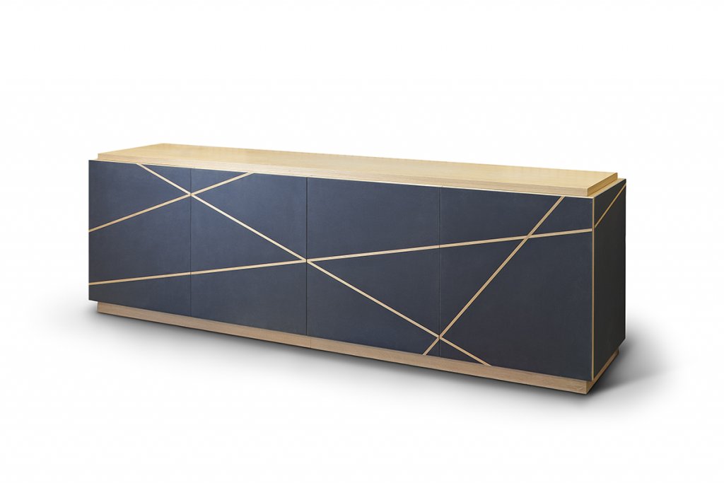 Part of the ‘Searchlights’ collection consisting of various storage pieces for modern living: From drinks cabinets to sideboards to AV and TV cabinets. Made with a distinctive abstract pattern of random timber lines that cut through the front and side elevations, the really unusual feature is the organic linoleum surface material which is both colourful and highly textured.