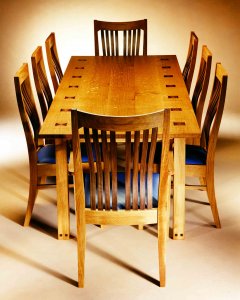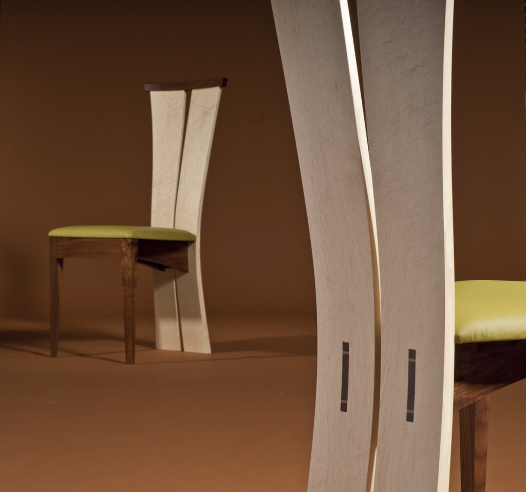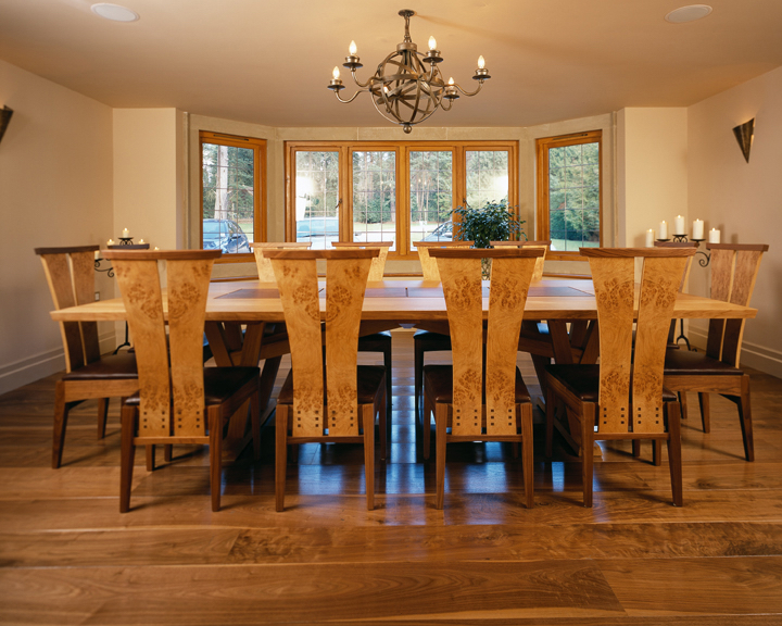 ‘Thurlestone’ was another chair that came off the back of a kitchen project. The client was a developer but this house was going to be for his own family in Surrey. In this case we also made the furniture for a dining room next to the kitchen. The table was an impressive 12 seater made of oak and walnut and complimented the lavish kitchen next door, he wanted a chair that would also have a ‘wow’ factor, using the same rich burr woods we had used in the kitchen. The Thurlestone chair used similar bent laminated back forms we had developed for ‘Guinness & Murphy’ stools, but in this case there were a pair of them that connected to the more traditionally constructed leg framework below. It is a very handsome looking chair and like Guinness & Murphy and Impala it carries what has become a bit of a trademark detail of the overhanging top rail. Despite really liking this chair we only ever made one set. There is more on this kitchen and dining set project in the Case Study.
