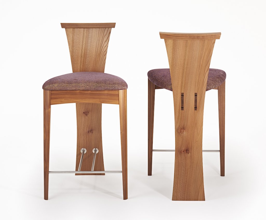 ‘Guinness & Murphy’ was our response to this. The name actually came from the black and chocolate labradors the client owned, but I liked the play of the words for a bar stool and its associations with propping up the bar with a pint. It stuck. It’s a really elegant piece because of the single elongated curved back and leg panel. The other key feature is the inclusion of the stainless foot frame which acts as the tie-beam between the 3 legs. It also has a very ‘crafty’ through-wedged, tenon joint from the centre frame through the back panel which expresses the way it’s made very clearly. Guinness and Murphy are still a favourite of mine, so much so I bought that original 2003 set back to put in my own kitchen 15 years later. They still look like new.