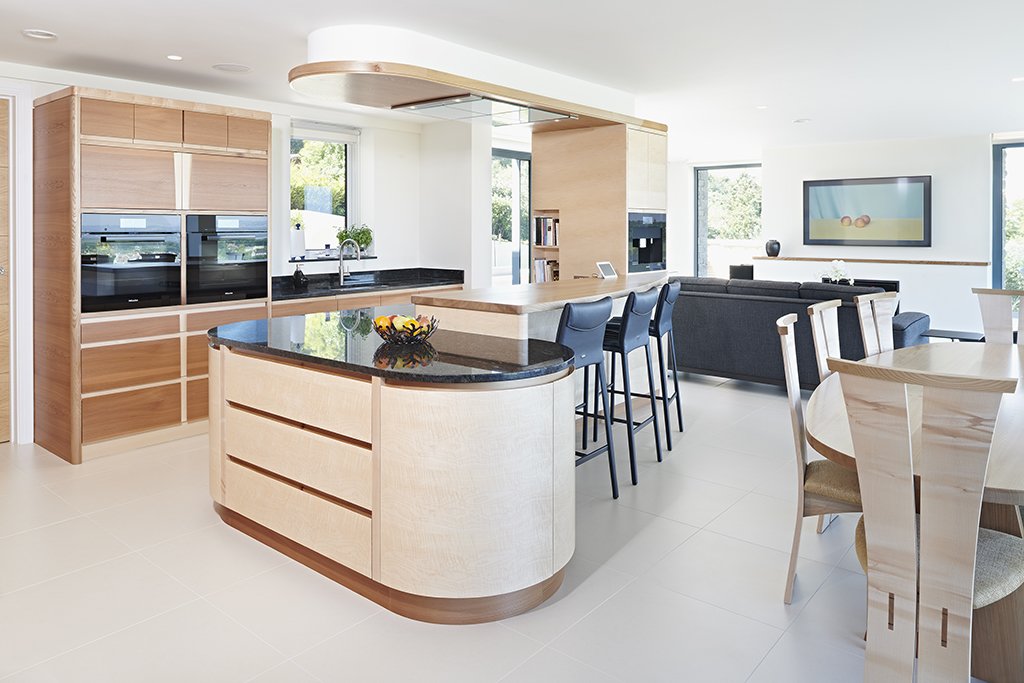 The clients discussed their likes and dislikes with Simon and from this he was able to produce a number of concepts and ideas, some fairly mainstream, others pretty whacky and, in consultation, they were able to refine those ideas down to what they really wanted in their kitchen. They had been clear from the start that what they had been attracted to was the richness and ‘curve-appeal’ of our kitchens but the images on our website were generally too dark for them. With this in mind, Simon was able to aid their timber selection by guiding them towards two lighter shade timbers: sycamore and elm. For the worktops, Simon discussed with them the use of Corian which comes in a whole array of colours and which we had recently used in another kitchen. However, the clients preferred to use a natural material and in the end they chose an Uba Tuba granite which, while a dark grey, almost black, is speckled with much lighter opaque, fossilised flecks with subtle tinges of blue/green. It reflects light and colour differently during the course of the day in places almost becoming translucent at times.