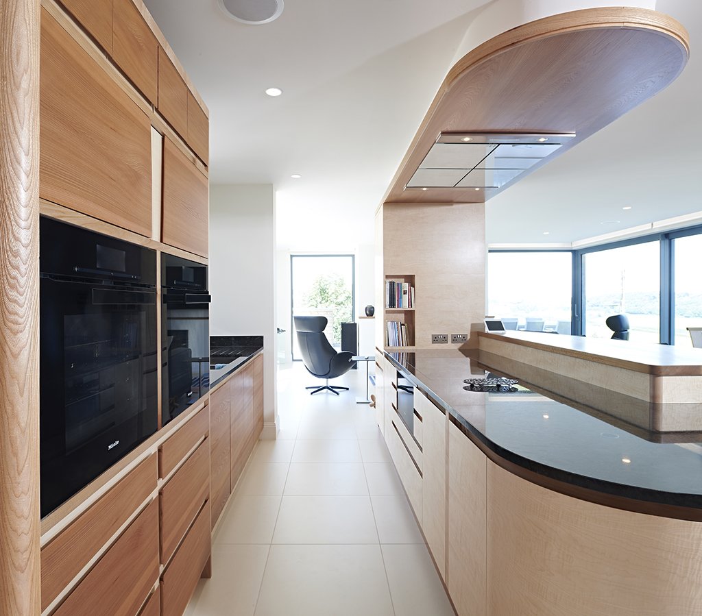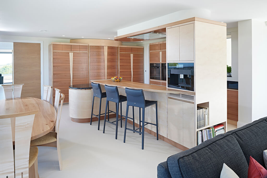 The L-shaped island wraps around the elm topped breakfast bar. The island is constructed of sycamore with elm details in contrast to the rest of the kitchen where the timbers are reversed. The Miele induction hob is positioned on the island so as to allow the cook to gaze through the window at the magnificent views of the landscape, or have a conversation with friends or family seated at the dining table, breakfast bar or on the sofa, while stirring the sauce. Beneath the hob is a Miele warming drawer. On either side of the warming drawer are small drawers for spices whilst the rest of the island houses a range of drawers and our now signature curved front cupboards which were so desired by the client and are perfect for storing the crockery and cutlery.