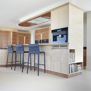 The final wall of the kitchen has a run of floor to ceiling cabinets. The left hand one of these, closest to the dining area is a drinks cabinet from which the aperitifs and wine can easily be served without the need to disturb the cook. This cabinet contains a Liebherr wine fridge at the bottom with shelves either side and an internal granite worktop and shelving for bottles and glasses above. The stand out feature of this cabinet is the surprising coloured interior, lined with dyed blue, birds-eye maple veneer the colour of which is enhanced by internal lighting which, like a fridge, automatically comes on when the door is opened and really brings the stunning blue texture to life, delivering a real ‘wow’ factor.