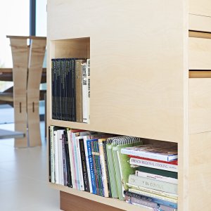 As well as the kitchen and dining areas, we were also asked to contribute towards some of the other rooms in the house. Both the living room and the study required shelving and display units and so, while the brief for each was somewhat different, Simon conceived them as a related pair.