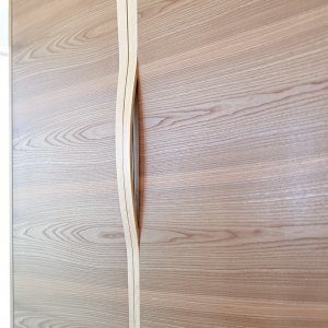 The last unit of this wall contains the integrated Liebherr fridges housed in our cabinetry and featuring, like the drinks cabinet a ‘sexy’ laminated sycamore handle. Theses handles run the full vertical length of the doors crossing the horizontally laid elm veneer that runs through the whole series of cupboards. When asked about his favourite part of this kitchen, our senior maker, Mike said these handles were the most satisfying to make and the part he is most proud of.