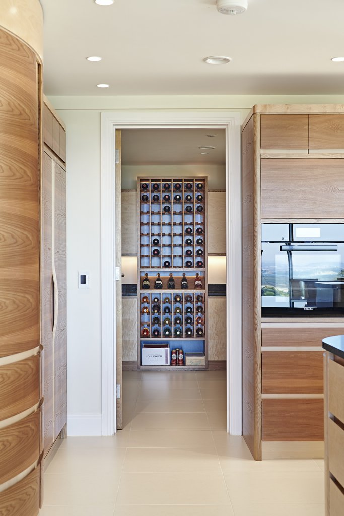 Just off the kitchen and visible from it if the door is open, is the pantry. This room provides extra storage and in particular features a floor to ceiling wine rack with the same eye-catching, dyed blue, birds-eye maple as was used in the drinks cabinet. It is back-lit using warm white LEDs which give a seductive glow and shine through the bottles giving them a jewel-like appearance.