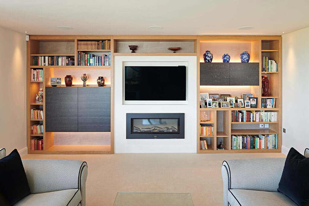 The back lit boxes contrast with the LED spotlights used to pick out the featured objects in their custom made shelves. Warm white LEDs were used throughout to provide a rich, warm glow, creating ambience for an evening watching the television.