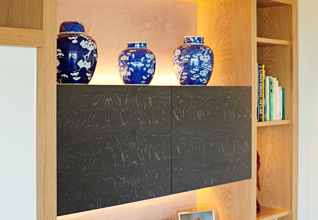 In the living room, the clients asked Simon to design a whole wall to frame their large, 55” TV and the cassette fire-place, to provide storage space, book shelves and also to include feature display shelves for some of their treasured possessions. Ever the artist, Simon shied away from a straightforward series of shelves and characteristically went for a Rothko inspired abstract design which adds interest and really makes the feature objects stand out. The timber for this unit was solid oak with figured ebonised oak in a charcoal grey finish highlighting the oak’s strong medullary rays, and figured grey sycamore providing a silky back drop on the back panels. The cupboards form black boxes which are back lit using LED strips to give the impression that they are floating and to draw a comparison with the black rectangles of the TV and the fire, incorporating them into the whole and making them part of the art form.