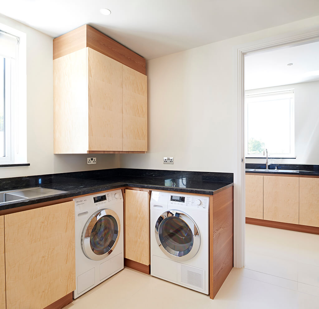 Using the same palette of materials provides a visual link to the kitchen as well as a kind of colour coding as to the use of the cabinetry. As the room is smaller with less natural light, the other cabinets in here and the utility and boot rooms which run off it are constructed using the sycamore as the main timber with elm details. Once again Uba Tuba granite is used for the worktops. Both the pantry and utility room have their own sink and the utility room is equipped with Miele washing machine and tumble dryer.
