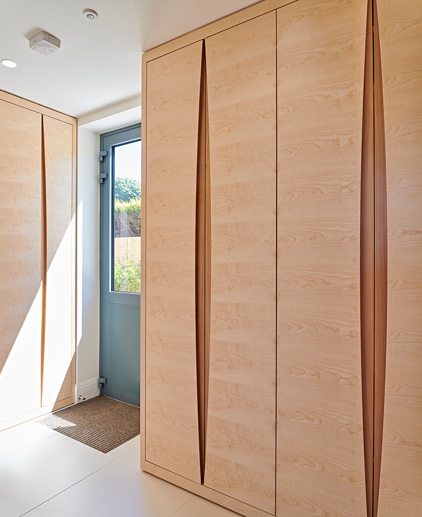 There is a false wall-cabinet in this room which covers the MVHR (Machine Ventilation Heat Recovery) unit, controlling the heat exchange system, and in the boot room the boiler is also tucked away in a cupboard. Other cupboards in here are effectively wardrobes to keep coats and boots, muddy from a tramp over the downs, out of sight. The shelves are carefully spaced to allow a tall adult’s wellies to be stored upright and out of the way.