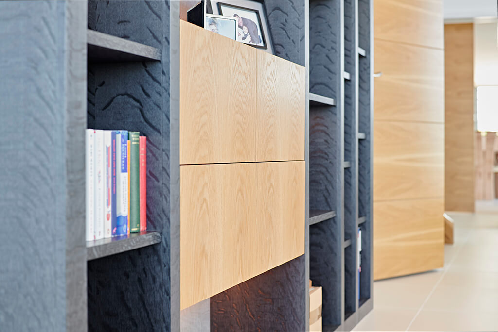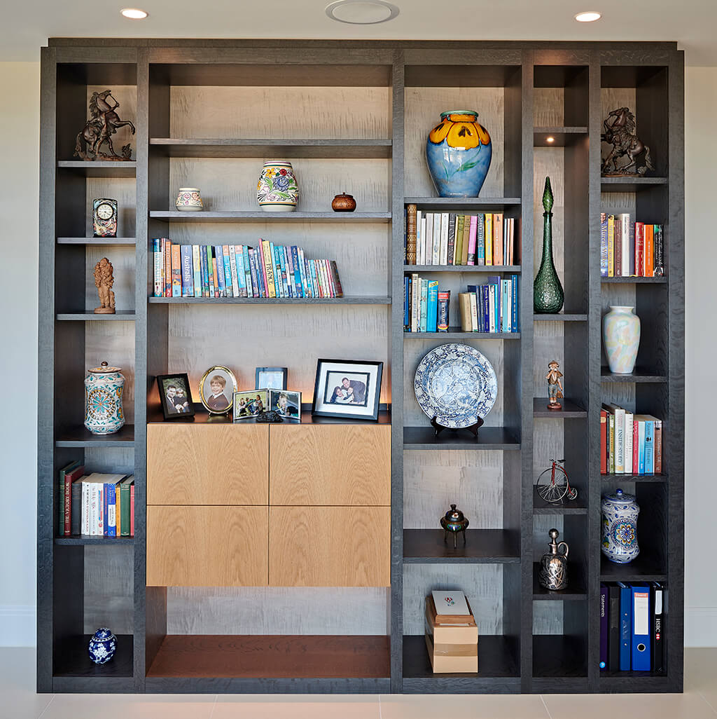 The study shelves use the same timbers but in the opposing format with the ebonised oak forming the frame work and the light oak featured on the drawer fronts. The client required some filing in the study so, instead of the floating boxes being cupboards as in the living room, the boxes in this room are in fact four filing drawers containing rails for suspension files. Once again LEDs have been used to create a combination of back lit, spot lit and unlit spaces providing a variety of options for book storage and for the display of favourite objects.