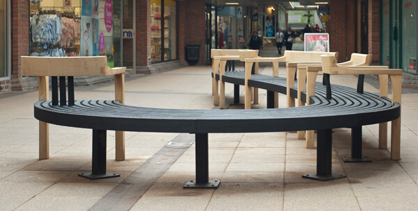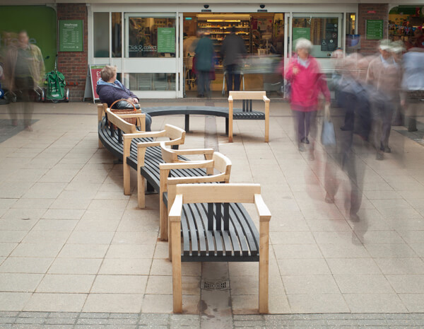 Simon Thomas Pirie were asked to replace the existing public seating in Tudor Arcade, a medium sized retail development in Dorchester, which was going through a substantial renovation and refresh. The new public seating was to act as a focal point, a meeting place and conversation piece on top of its existing seating and resting functions.