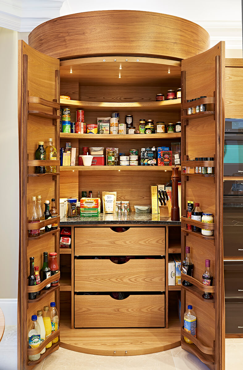 The run starts on the left with the feature curved drum larder unit. It’s a real ‘tardis’ inside those big burr elm doors. As they are opened, the internal LED lights come on to reveal vast amounts of storage on shelves and in deep drawers. There are also adjustable racks on the backs of the curved doors for more bottles, jars and spices. All the dry non-perishable, food items are in one place at the heart of the kitchen.